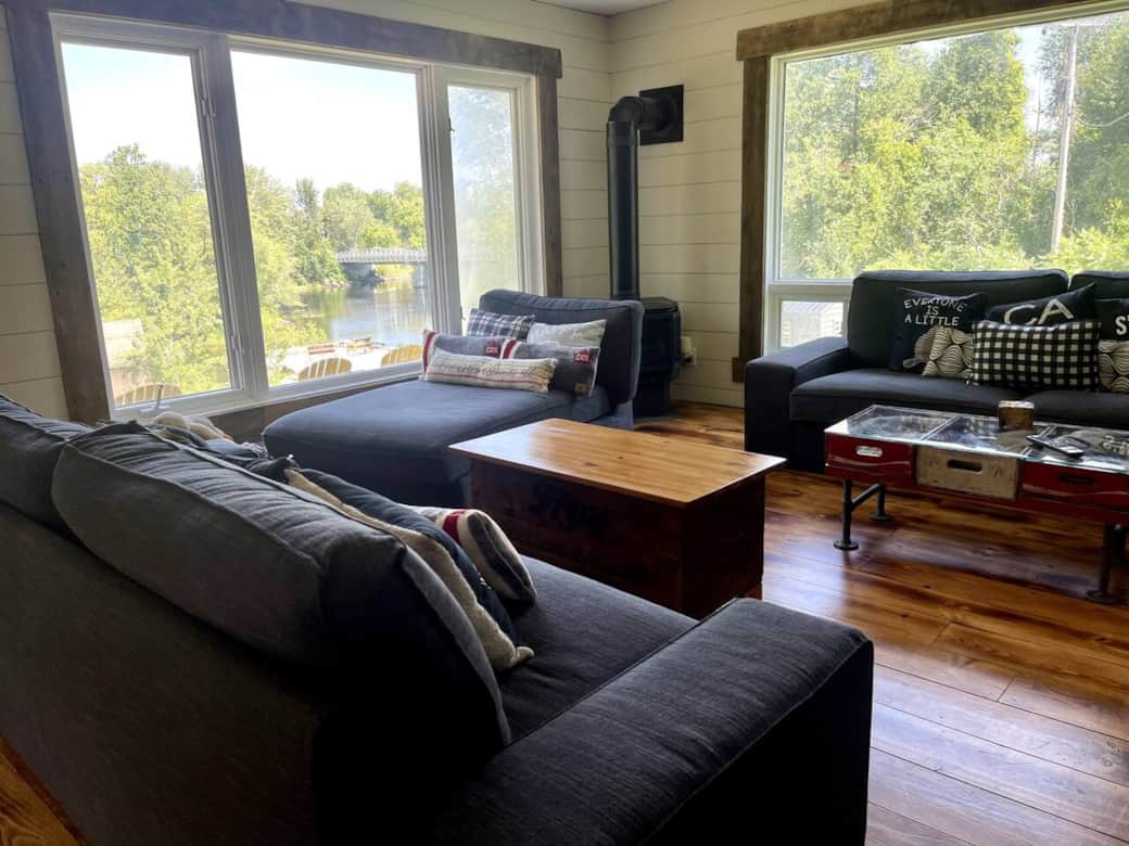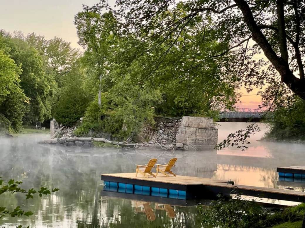In summer, guests can enjoy the calm walk-in waterfront, dock access, campfires, and river activities including kayaks and canoes. Outdoor amenities also include a BBQ, lawn games, and open green space for families to relax and play.